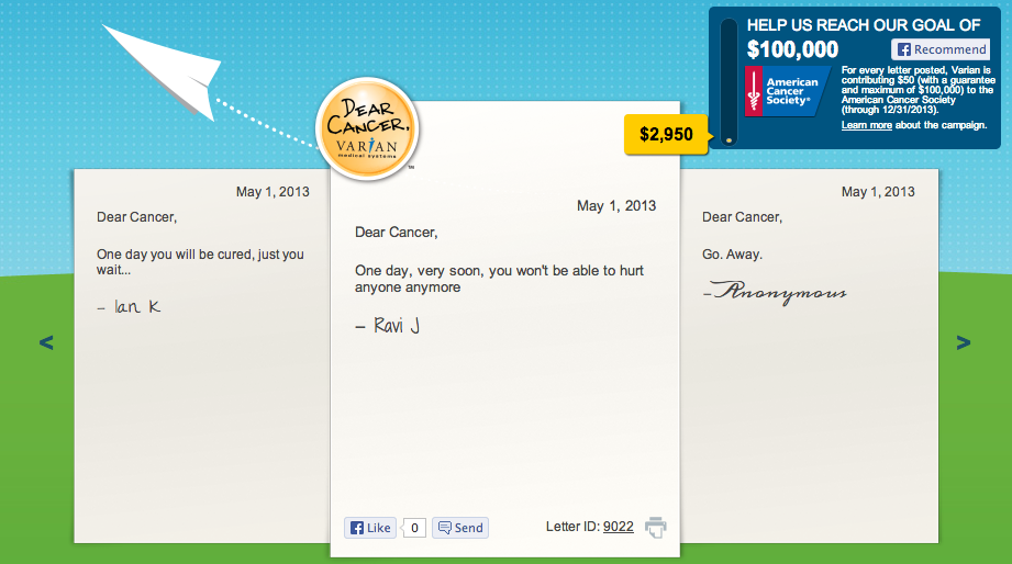 Writing letters to cancer has a similar function for patients, as evidenced by this fascinating fundraiser for the American Cancer Society. As a strong proponent of writing as a therapeutic process in the face of illness, I think that letter-writing can be incredibly empowering. It’s fascinating to see how people address cancer: some violently and aggressively command cancer to follow their mandates, while others respond more passively to its malicious nature and tempestuous effects.