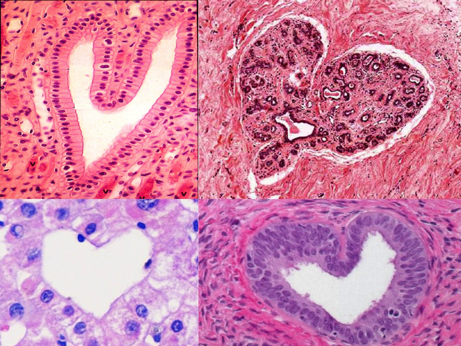 This collage, motivated by the recurring appearance of the heart shape in non-cardiac tissue, demonstrates how the heart shape we so commonly associate with love can in fact exist outside the organ of the heart. Taken from kidney, mammary gland, liver, and prostate gland tissue, these samples demonstrate how the heart shape lives on structurally in other bodily organs. These hearts are constructed with different kinds of epithelial tissue from simple cuboidal epithelium to simple squamous epithelium; different cells come to naturally construct the heart shape. The array of colors arose from the different dyes used to illustrate the tissue structures. The basic dye hematoxylin binds to basophilic components like nucleic acids and ribosomes, while the acidic dye eosin binds to acidic components like protein. Although the heart shape is embodied differently in these various organs, it maintains the basic structure of two symmetrical halves that coalescence to create a whole.